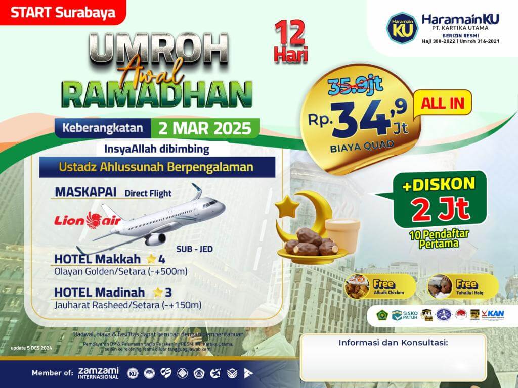 Umroh Awal Ramadhan - 02 Maret 2025 - Start Surabaya