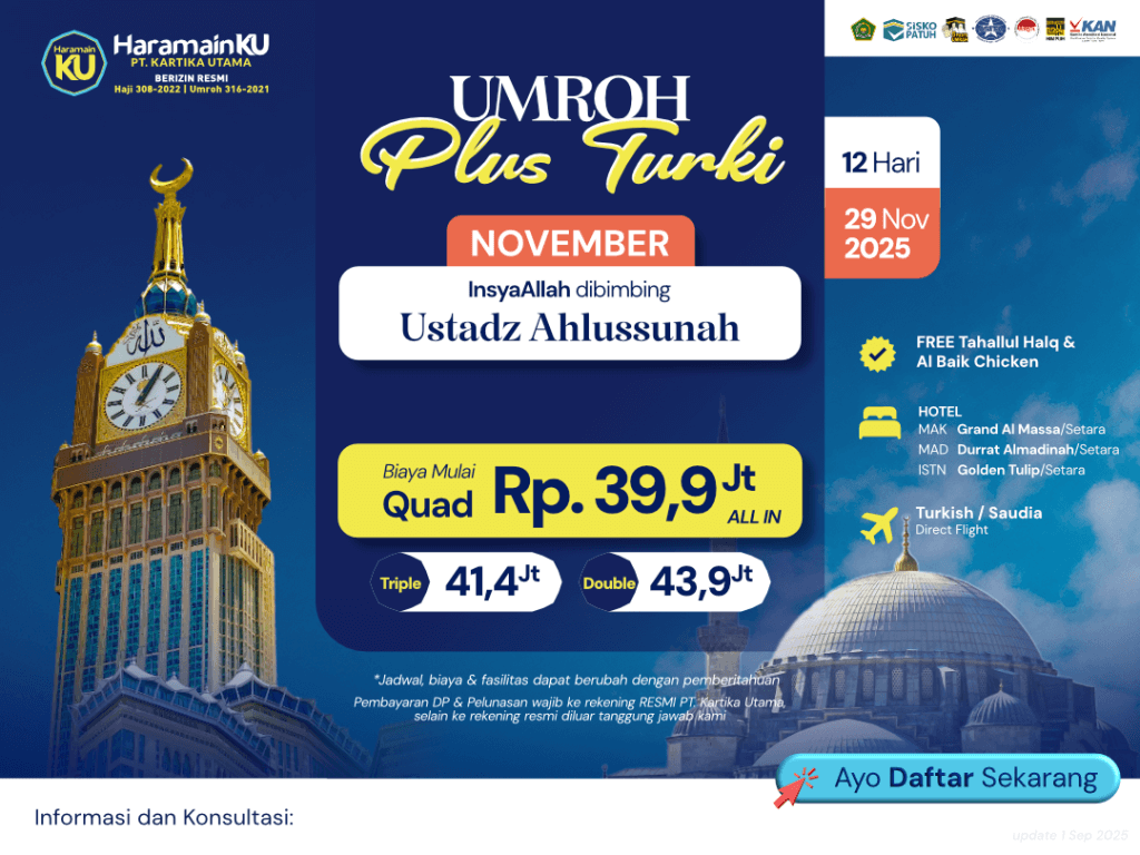 KETENTUAN : Jadwal, Biaya, dan Fasilitas dapan berubah sewaktu-waktu mengikuti kebijakan pemerintah KSA dan Indonesia